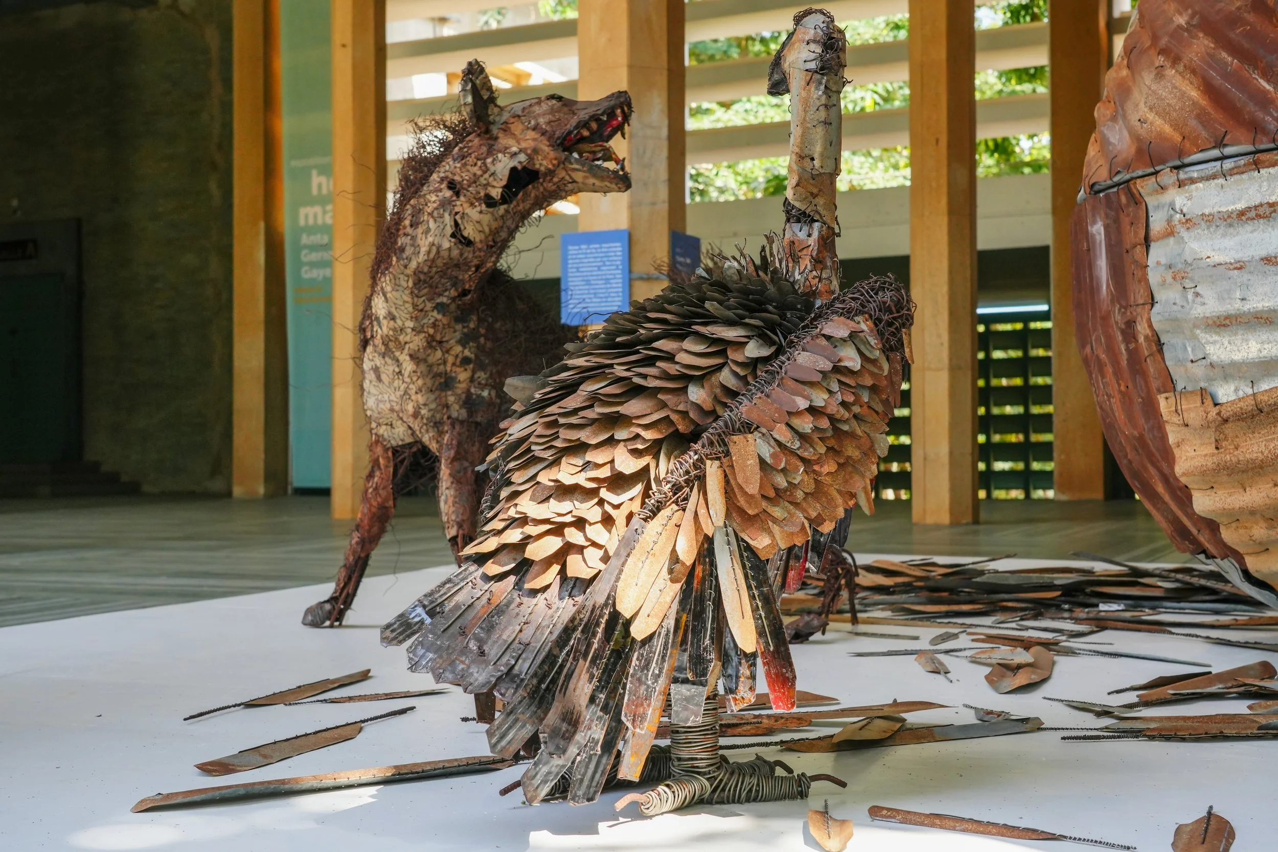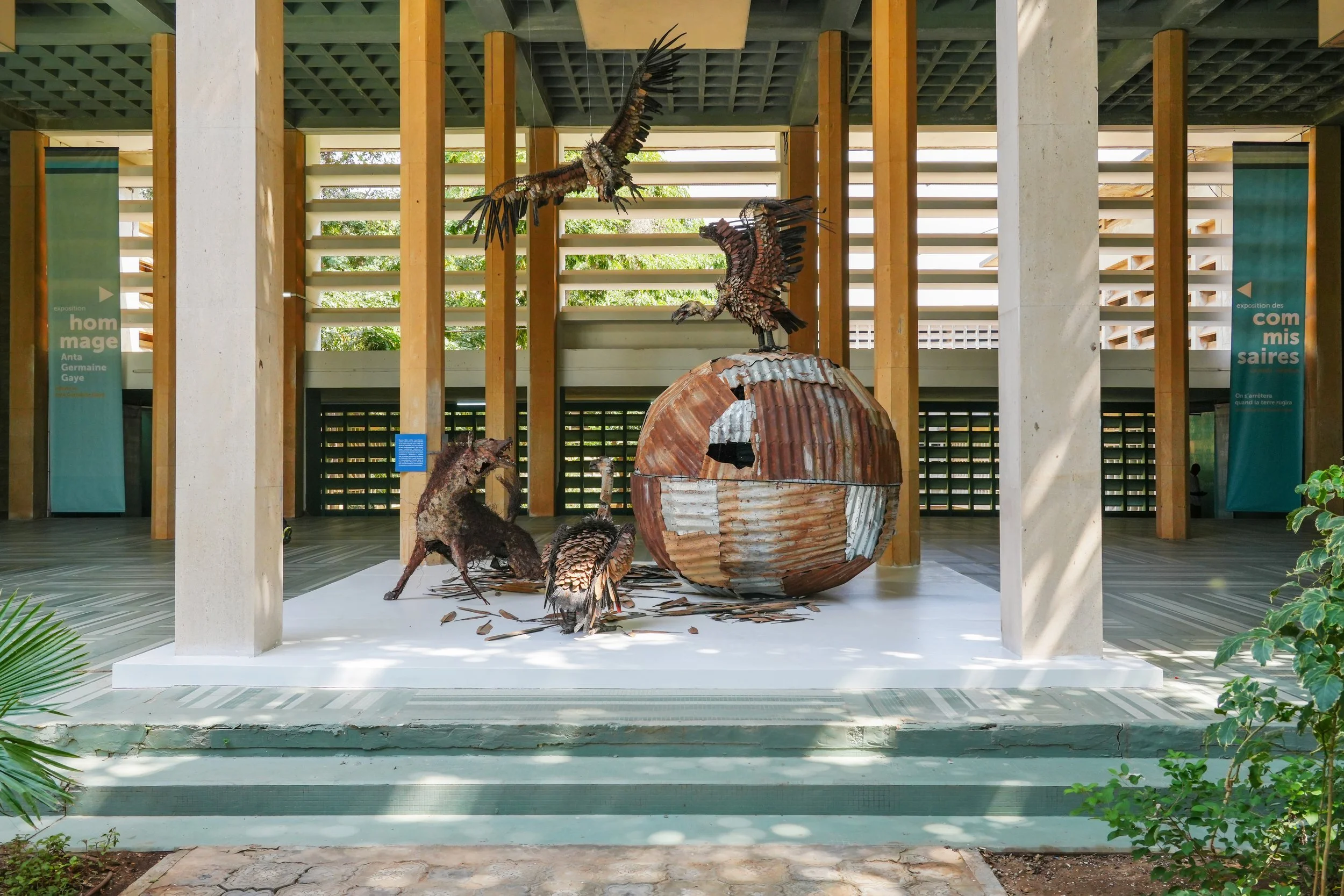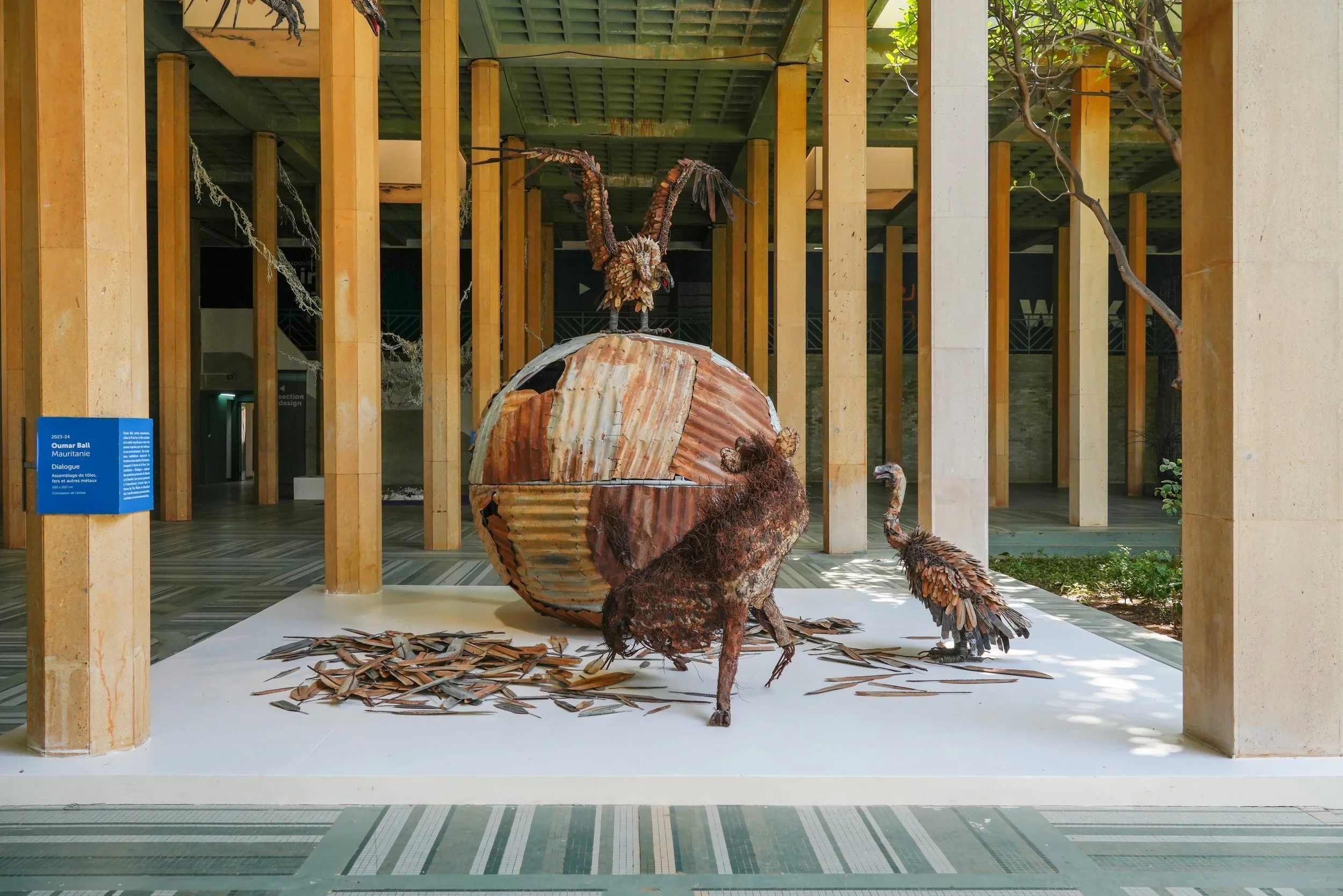 Là, près du manguier, encadré par les piliers comme un immense tableau, un autre tumulte. Lui, ajusté, silencieux. Oumar Ball saisit la vie par le milieu. Son installation Dialogue met en scène trois vautours et une hyène. Ils la toisent, l’encerclent. Elle se défend, elle grogne. L’artiste plasticien qui modèle la tôle et la ferraille avec brio comme s’il s’agissait de matières obéissantes, présente des figures particulièrement réalistes, à l’échelle. Dialogue expose un point de contact, un rapport de force. L’installation met ainsi à l’épreuve son propre titre qui implique le langage et la dualité. Il s’agit du langage des corps, plus franc et naturel que les mots. Oumar Ball érige les corps comme les vecteurs d’une parole-pulsion, une parole révélatrice des choses profondes puisqu’en figeant sous nos yeux cette force brute en tension, il nous permet de mieux l’évaluer. Dans une mise en scène toute théâtrale, il allie différentes formes d’expression (plastiques et scéniques) pour donner à penser la rugosité des rencontres. Et, comme pour les contes d’autrefois, le spectateur finit par comprendre qu’à travers l’Animal, il est surtout question de l’Homme.