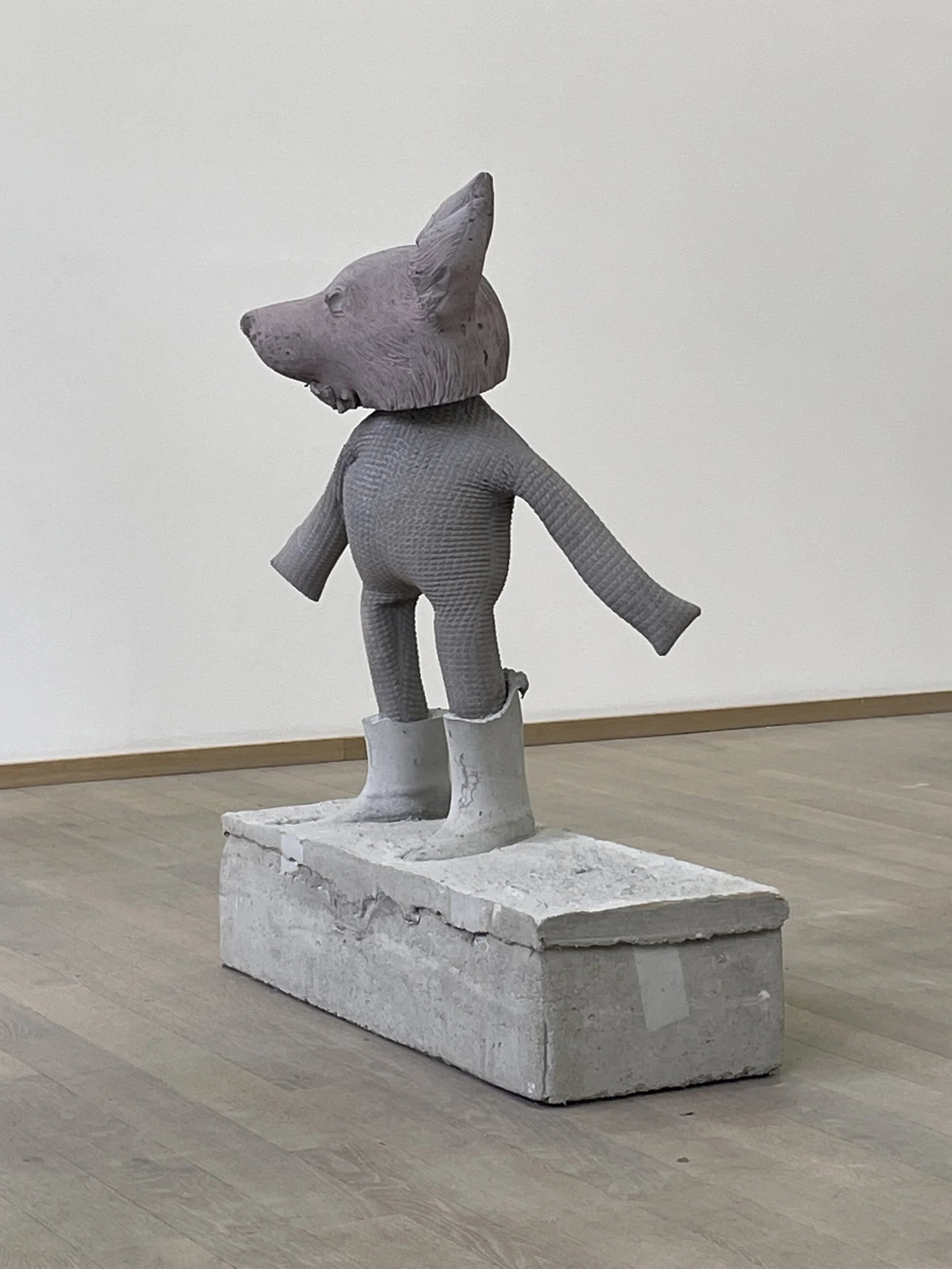 Spécialiste du détournement, le sculpteur façonne le bois ou le béton comme une pâte à modeler : les bras et les jambes sont deux boudins qui s’étirent. Puis il joue avec la matière. Le béton qui forme la partie inférieure du corps de plusieurs de ses personnages imite l’effet du tissu en velours des pyjamas de bébés. Cette autre sculpture est ventripotente. Sa bedaine s’affaisse ; ici, le béton paraît si mou. L’artiste pousse le réalisme. Là, il chausse un âne avec de véritables bottes de cavaliers qui forment ses pattes. Les semelles baillent, elles ont fait du chemin.