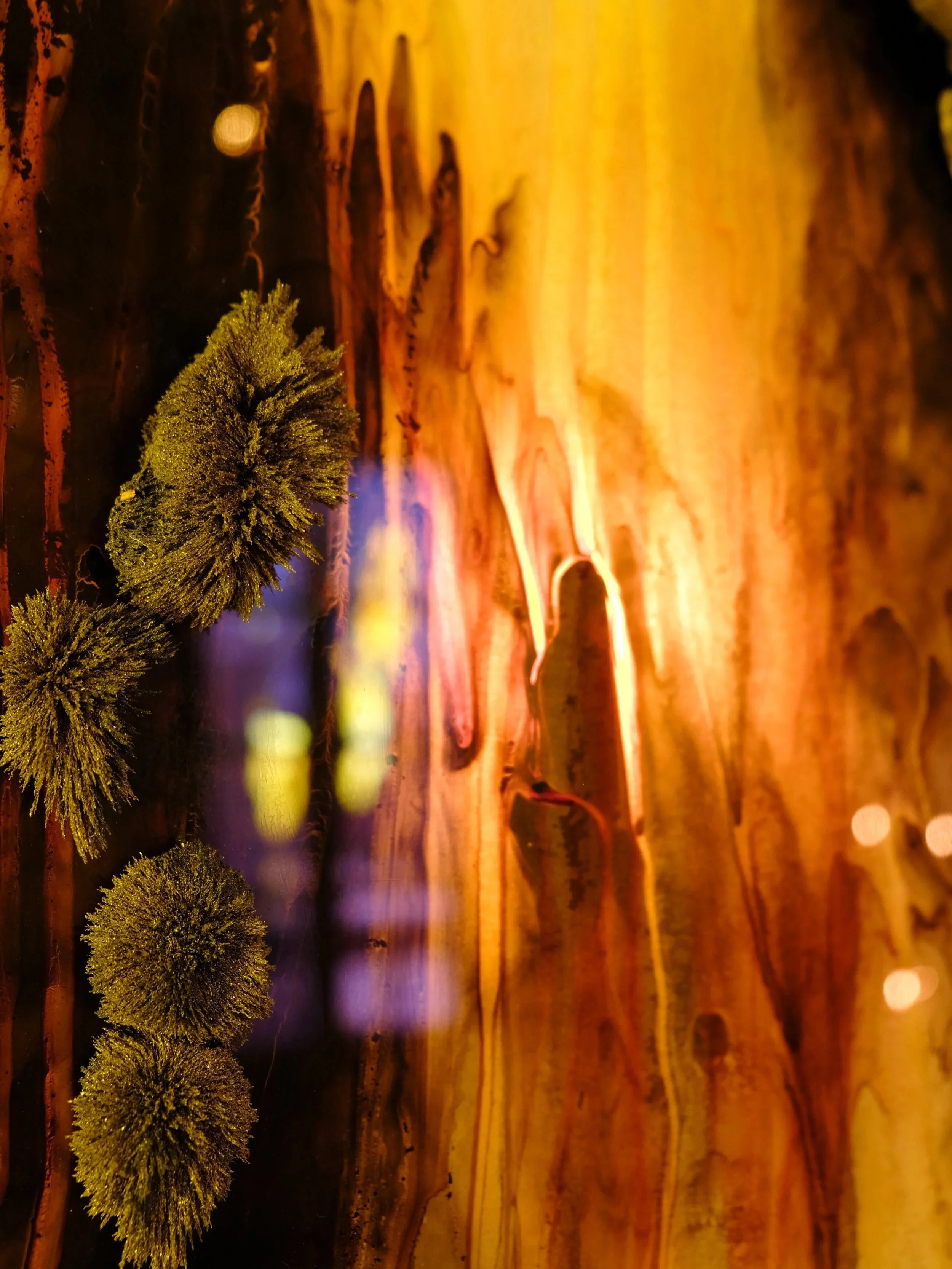 Pour rendre compte du spectacle de la nature, le jeune homme peint en strates, tout en transparence, avec différentes techniques. Il utilise le pastel, l’acrylique et le spray. Les couches qui se recouvrent offrent toujours une profondeur. Ce pourrait être l’illustration scientifique d’une découpe sédimentaire comme l’enchevêtrement des variations de couleurs de la flore qui s’agite au vent. Les épaisseurs de couleurs rendent compte de la complexité épatante de la nature.